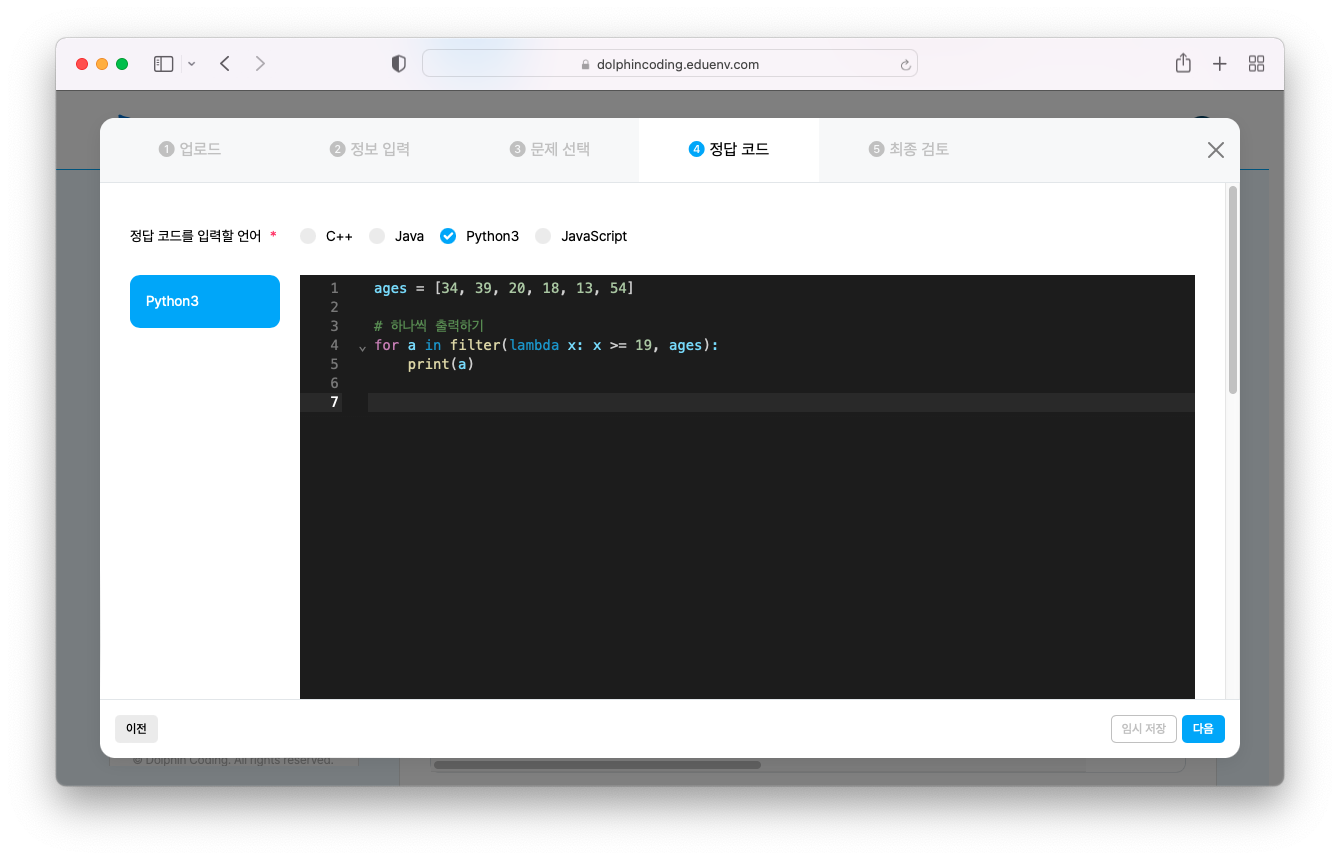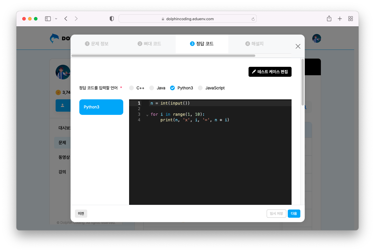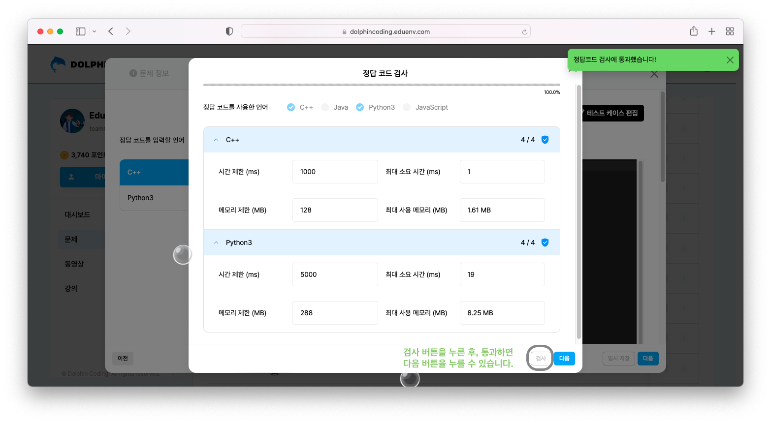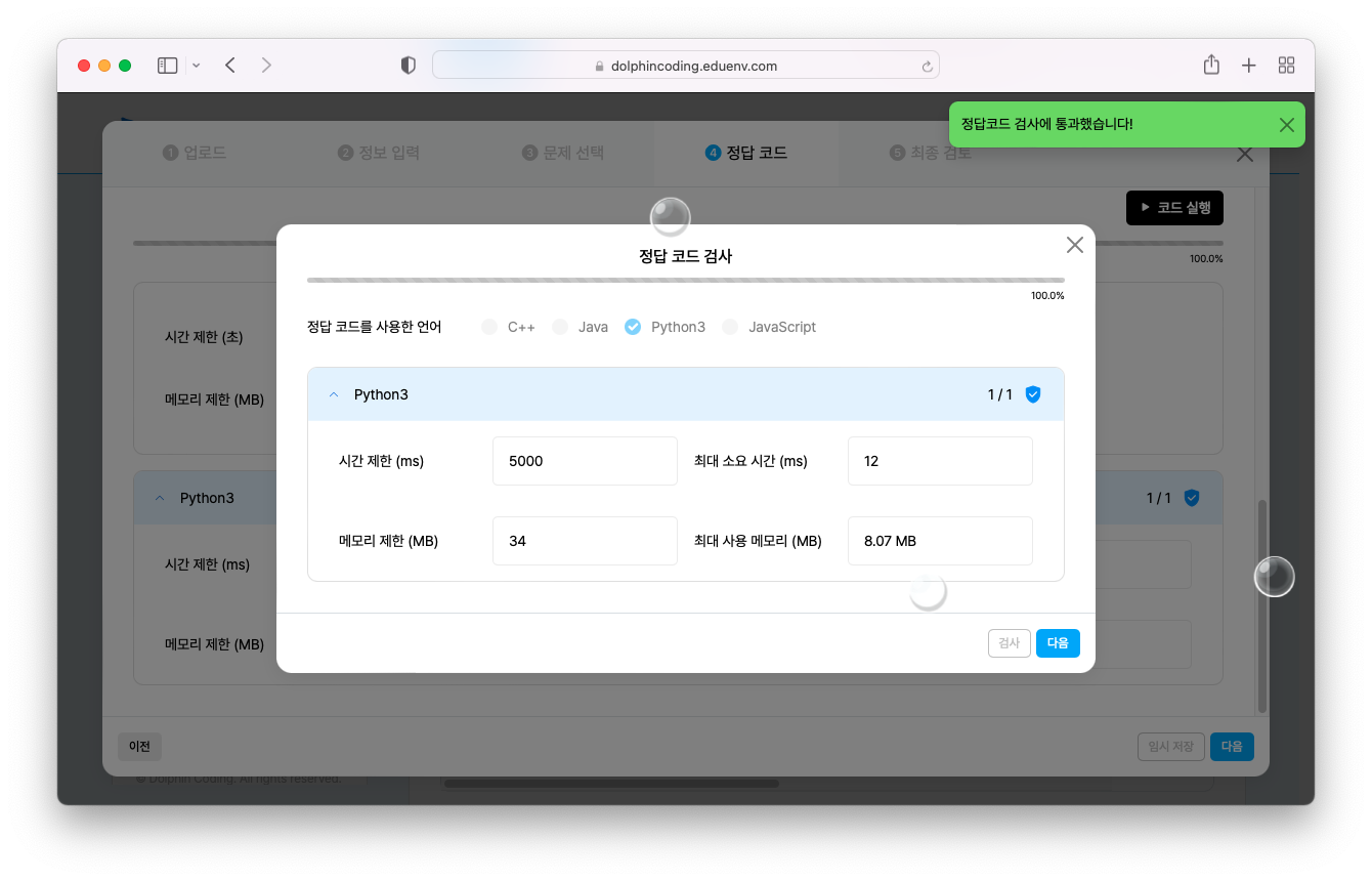여기까지 따라오셨다면 이제 문제 만들기는 거의 클리어하셨습니다! 이제 내가 만든 정답 코드를 검사할 차례입니다.