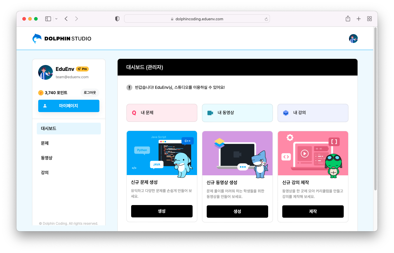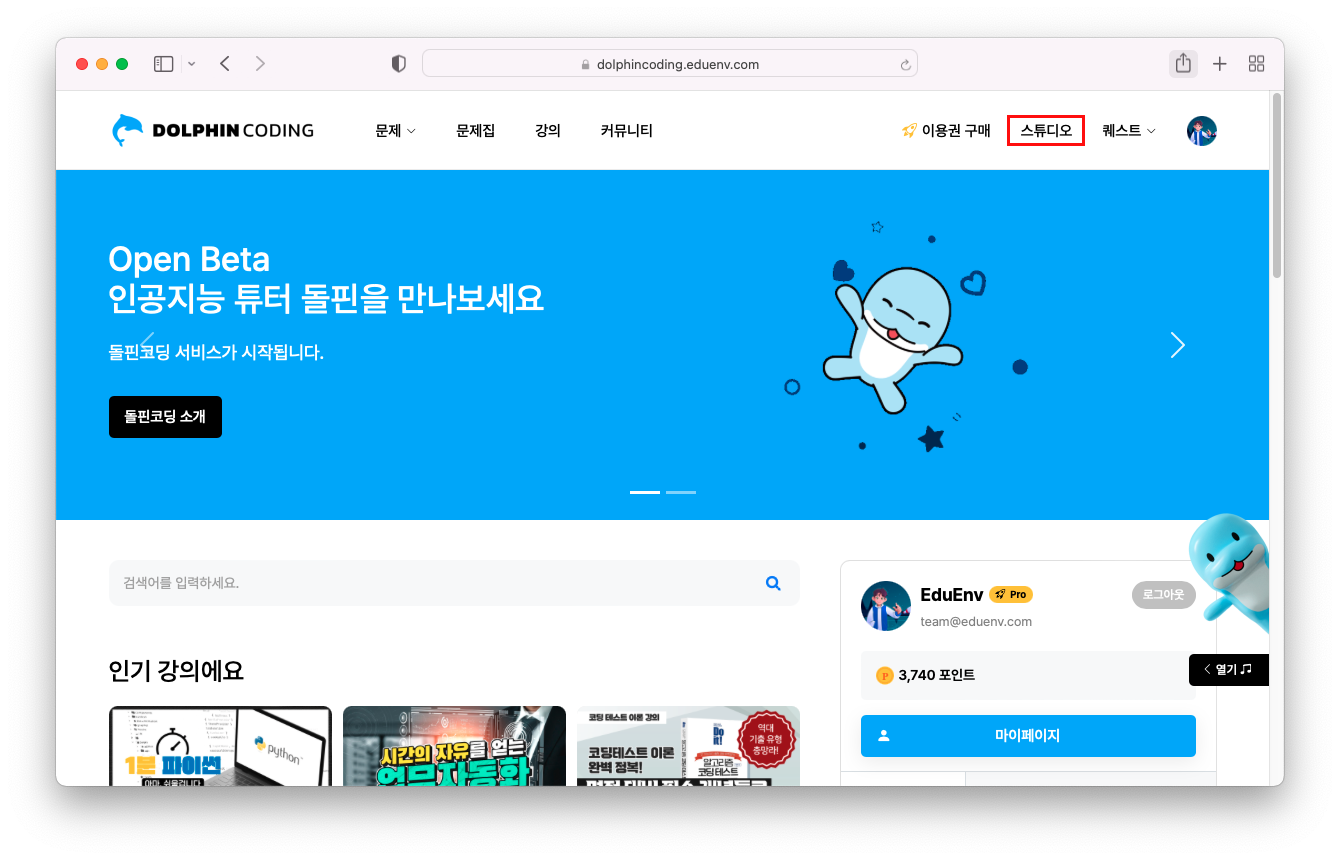 먼저, 돌핀코딩 홈페이지에서 로그인 후, 오른쪽 상단에 위치한 "스튜디오"를 클릭합니다.