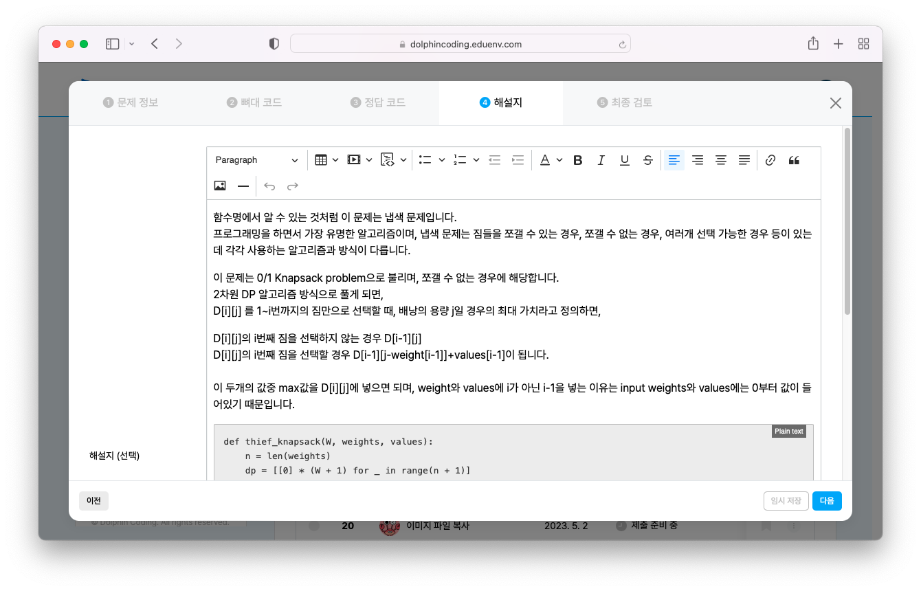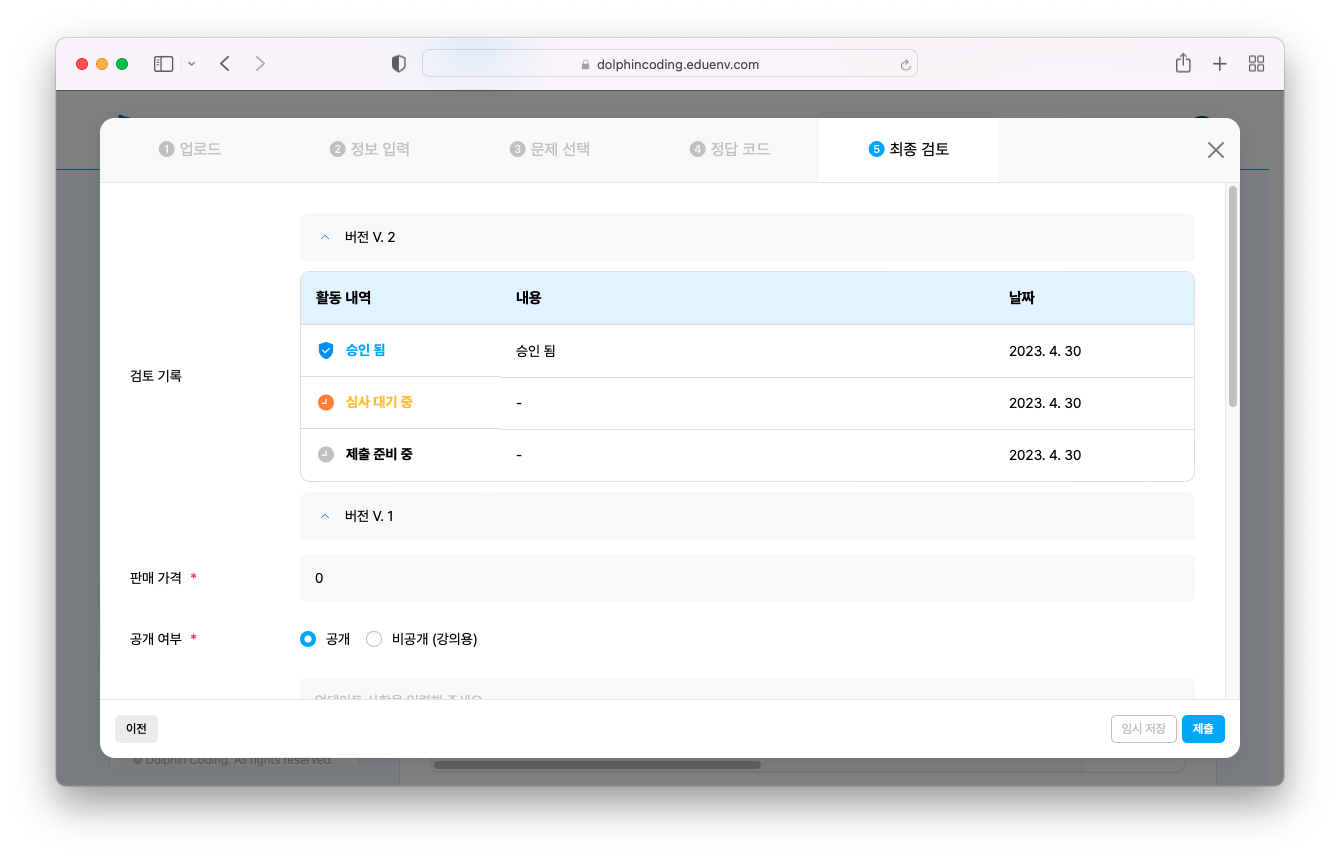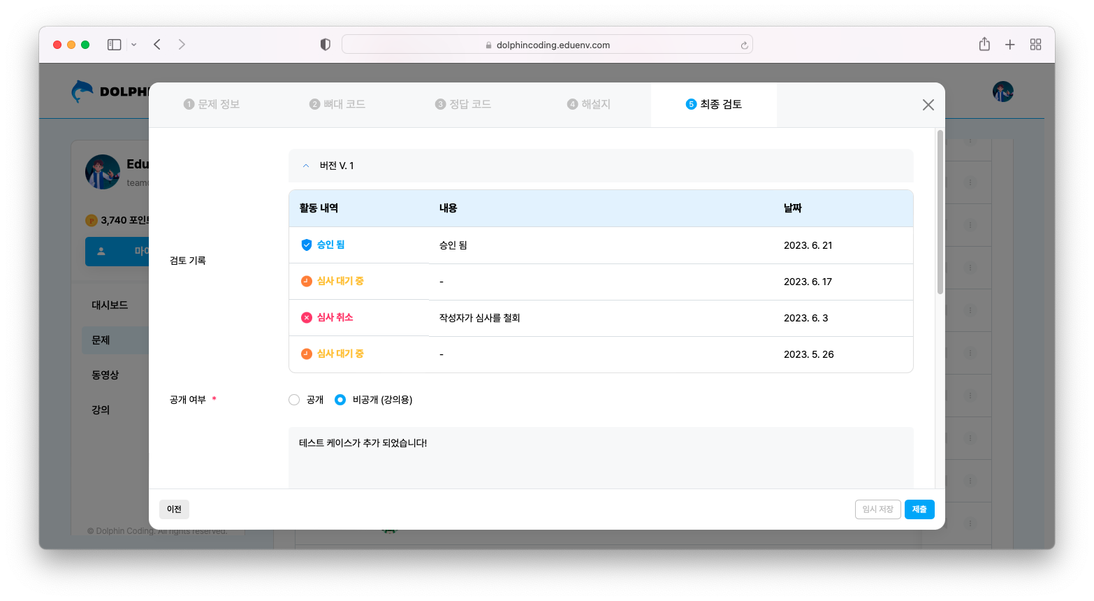 해당 문제를 돌핀 코딩에서 최종 검수하고 문제의 품질을 판단한 후에 공개됩니다.