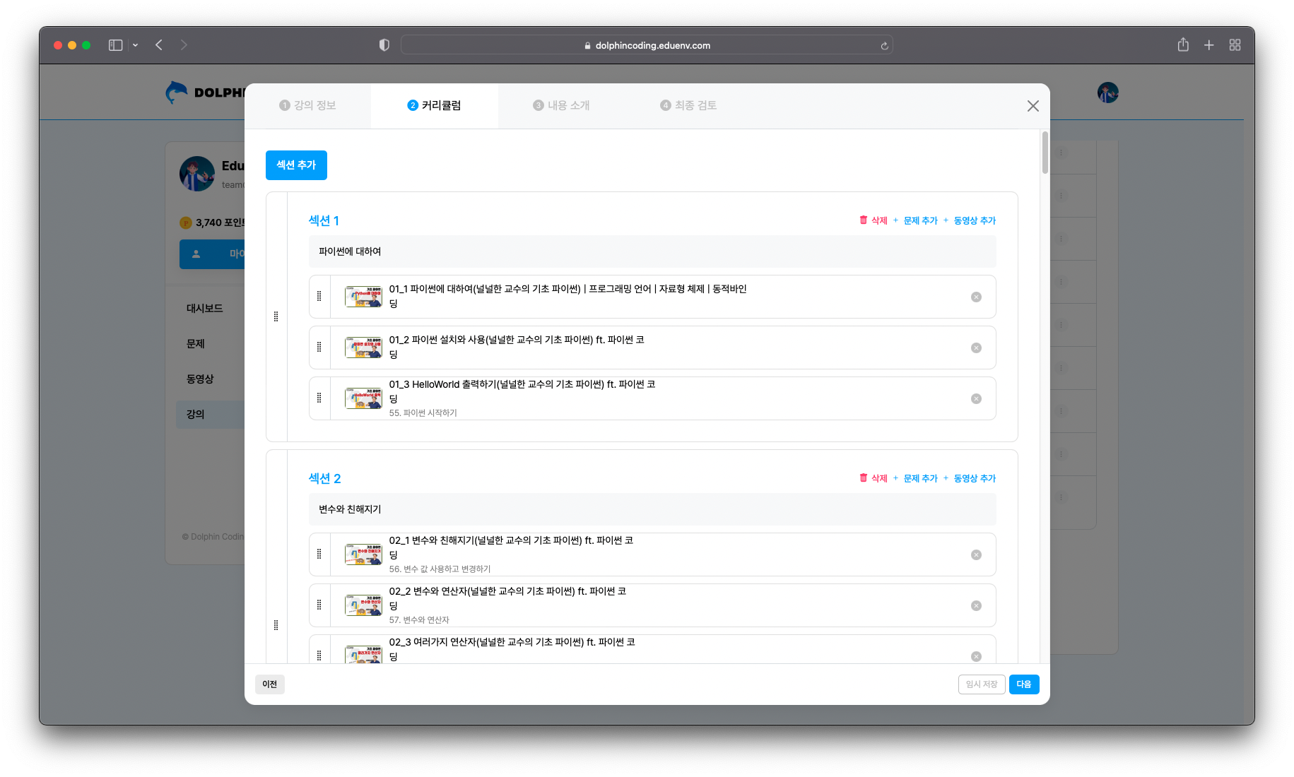 커리큘럼을 추가 후, 연결하고 싶은 코딩 문제나 동영상을 함께 연결하여 효율적으로 강의 프로그램을 설정합니다.