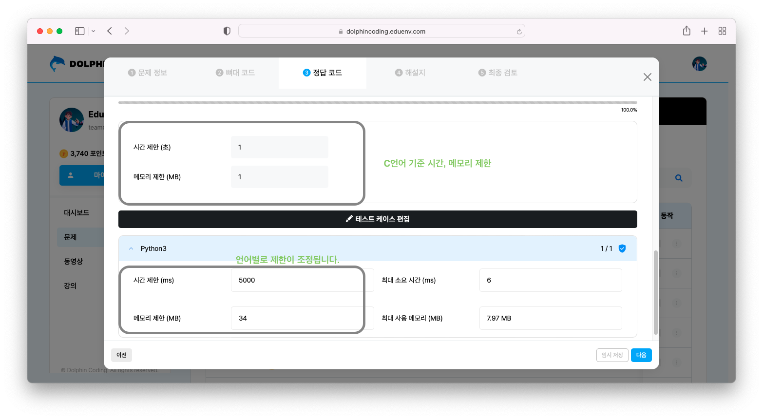 정답 코드 작성하기 > 테스트케이스 생성하기 > 시간제한, 메모리 제한 설정하기 > 검수