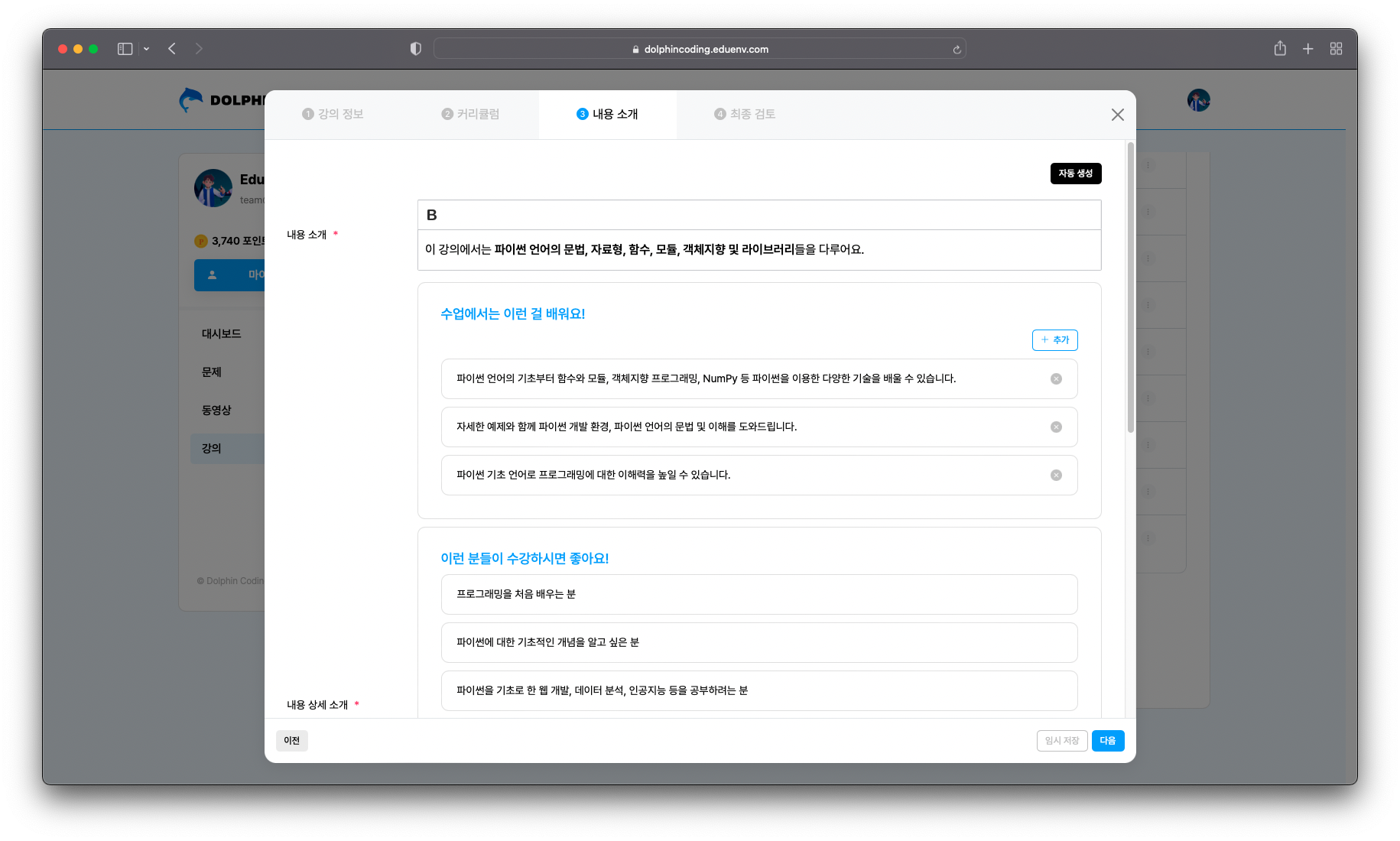 강의 만들기의 내용 소개에서는 수업의 상세 설명과 구성, 강의를 보여주고자 하는 타기팅 등을 선정해 구체적인 강의 프로그램을 만들 수 있습니다.