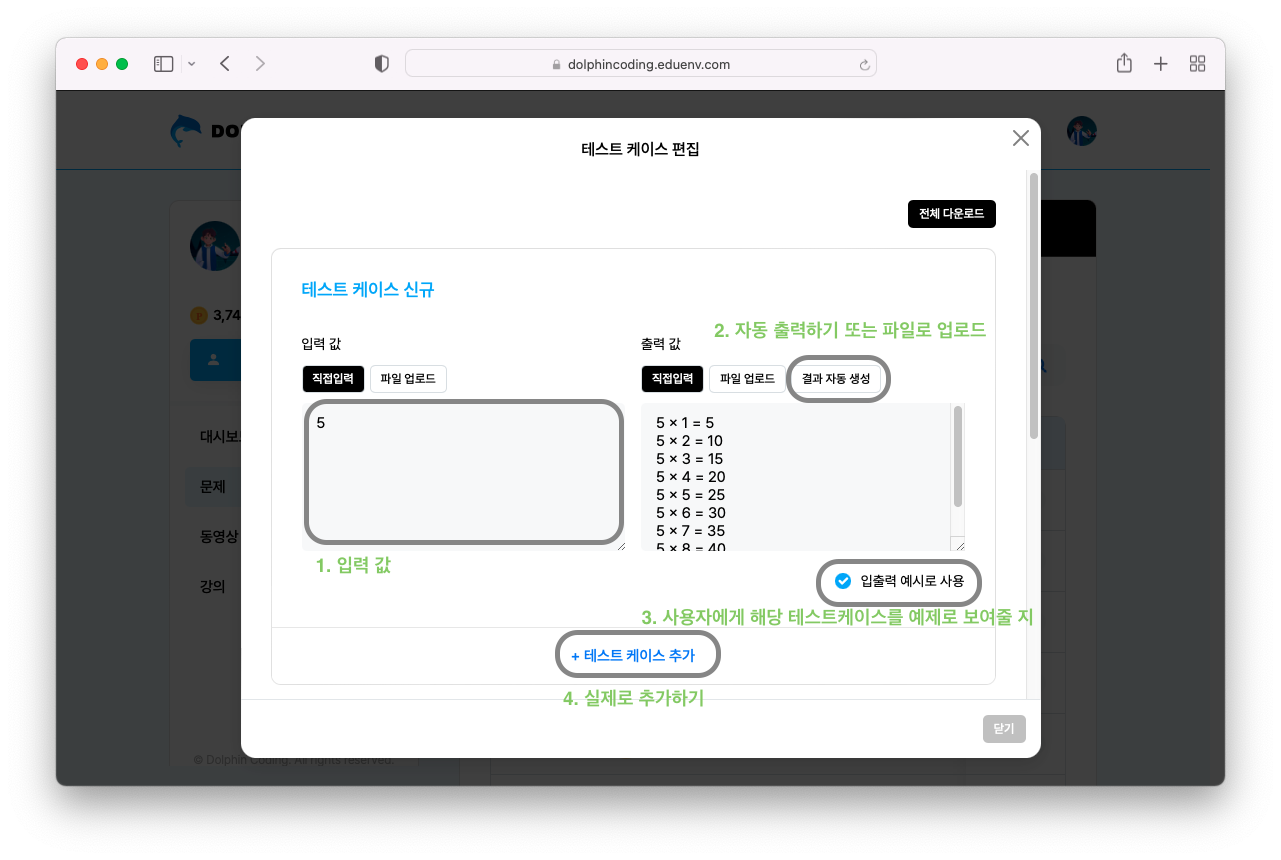 이렇게 입력값을 넣고, 직접 입력하거나 결과 자동 생성 버튼을 누르게 되면 출력 값이 나오고 테스트케이스를 추가합니다.
