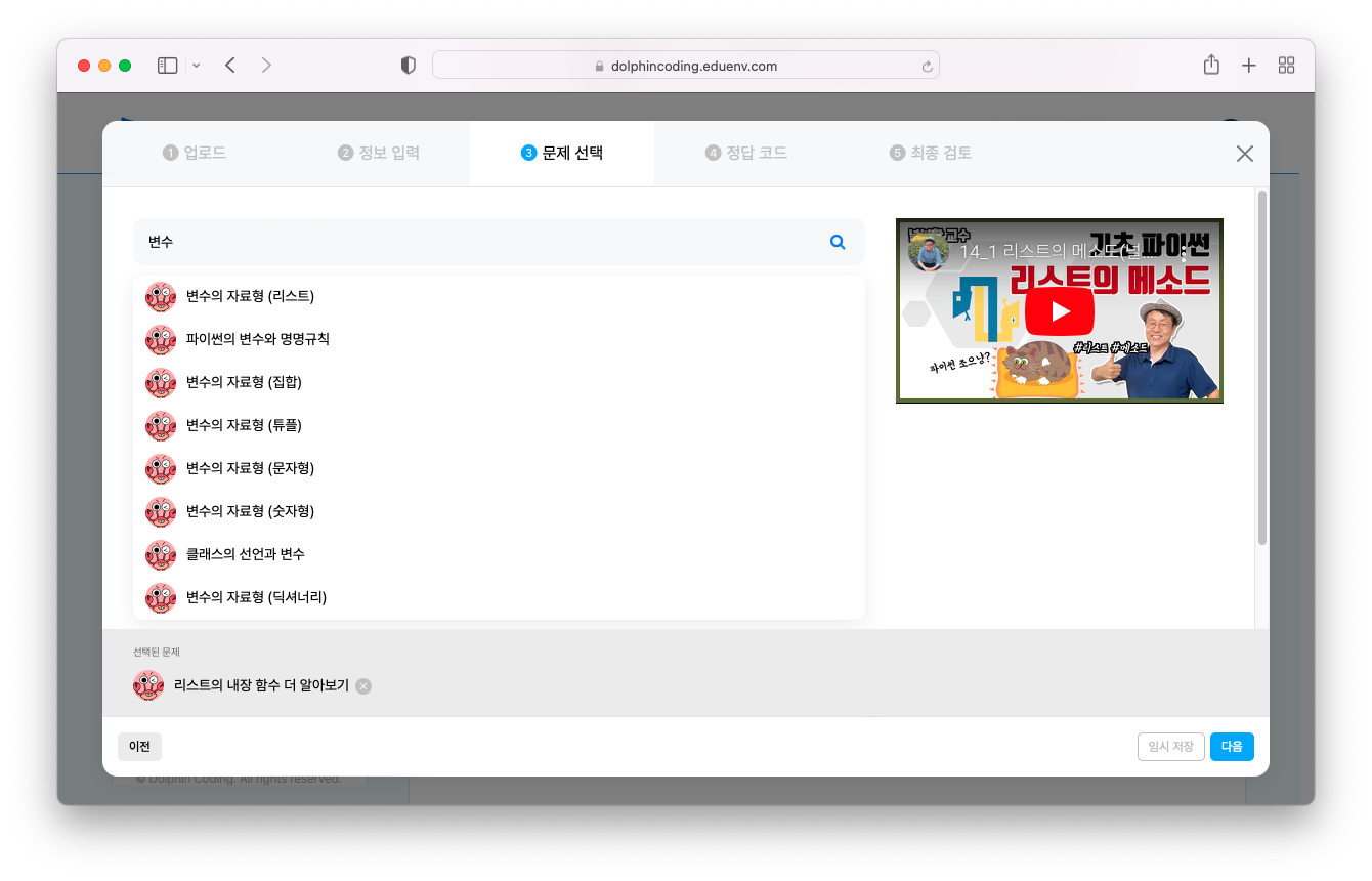 내가 만든 문제를 검색하여 연동 후, 문제를 풀어낸 정답 코드를 작성하여 검사를 진행하면 동영상과 문제 학습을 한 번에 제공할 수 있어요.