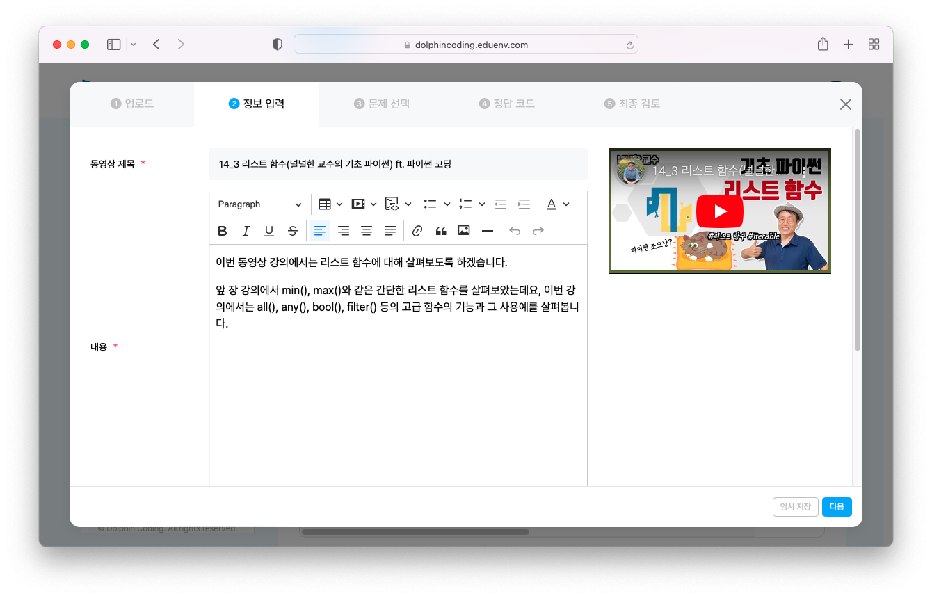 강의 내용은 내가 만든 동영상을 넣을 수도, 코딩 문제를 넣을 수도 있습니다.